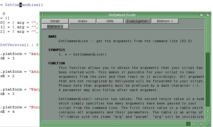 3.2: pressing Shift+F1 while cursor is over a Hollywood function opens the corresponding section of the hollywood.guide in write protect mode within GoldED in a new document, so you can now easily copy examples etc. and paste it into your source code