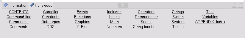 3.1: pressing F1 while the cursor is over a Hollywood function or keyword displays the corresponding section in the Hollywood documentation guide (context sensitive help); if cursor is not over a word, the main topic of the help guide is displayed