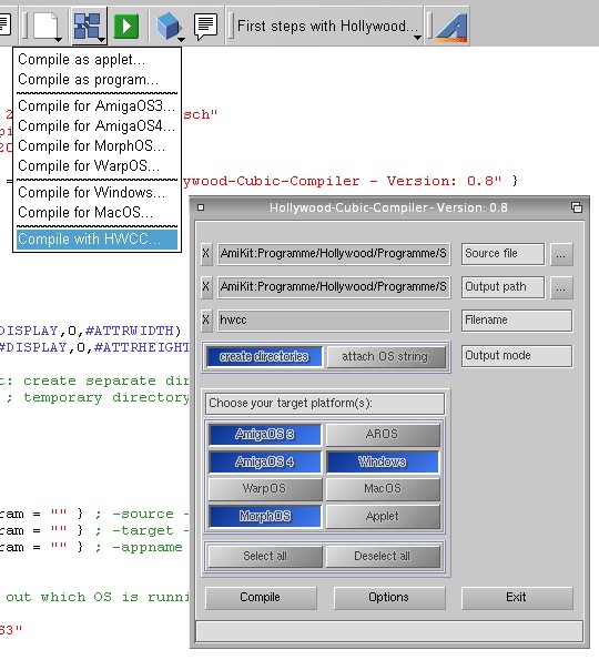 2.2: compile source code with separate tool "HWCC" (Hollywood-Cubic-Compiler), which is a GUI for compiling for different plattforms at once