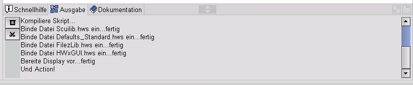 1.10: compile, debug and error output: Hollywood 4 users will now recognize a new container called "Output". This container show all compile, debug and error output instead of opening a new shell window. Additionally, if you click on a message line that shows an error you will be directed to the corresponding line in the source code. (V 1.1) Attention: AmiKit users should read the FAQ!