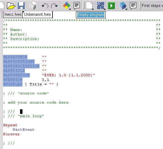 2.1: insert template text of a minimalistic Hollywood programm for quick coding start