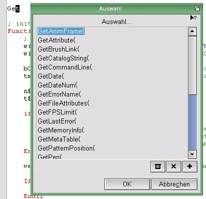 3.8: pressing Strg+Space after typing the beginning of a Hollywood function or keyword shows a list of all possible functions to insert at cursor position (intellisense)